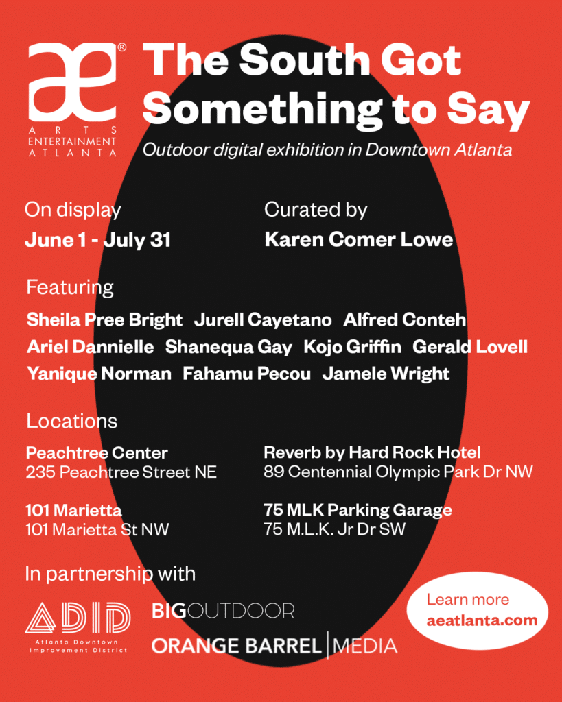 June 1-July 31 — “The South Got Something to Say” art exhibition: Borrowed from Andre 3000’s prophetic, 1990s-era proclamation, “The South Got Something to Say” is the second in a series of open-air exhibitions activating digital billboards throughout the Arts and Entertainment District of Atlanta. Presented by the Atlanta Downtown Improvement District and curated by Karen Comer Lowe, the digital exhibit — featuring work by acclaimed artists like Sheila Pree Bright, Fahamu Pecou, Shanequa Gaye and many more — is a “visual celebration of those enriching creators who are contributing to the everchanging footprint of the Atlanta Cultural community.” Free. Various Downtown locations. More info: aeatlanta.com.